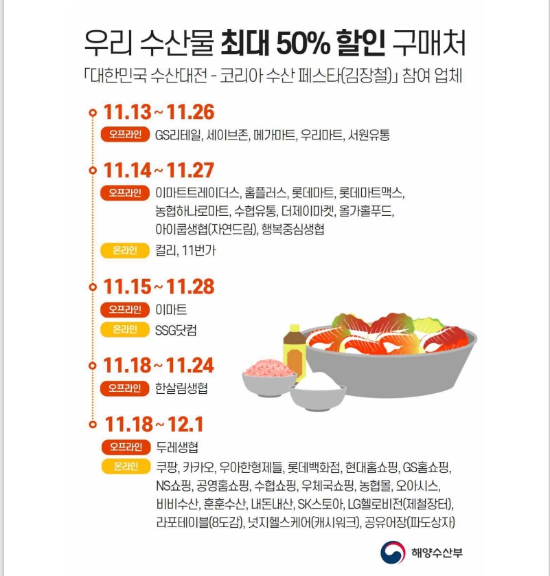 할인행사는 11월 13일 수요일부터 12월 1일 일요일까지 약 3주간 진행됩니다. 전국의 대형마트와 중소형 마트, 온라인몰 등 총 41개 업체가 참여하며, 오프라인 18개사와 온라인 23개사가 포함됩니다. 각 업체별 행사 기간과 세부 할인 품목은 대한민국 수산대전 공식 누리집에서 확인할 수 있습니다.