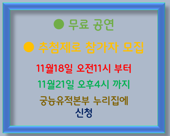 이번 음악회는 추첨제로 참가자를 모집합니다. 11월 18일 오전 11시부터 21일 오후 4시까지 궁능유적본부 누리집을 통해 신청할 수 있으며, 최종 당첨자 80명은 11월 22일에 발표됩니다. 만 65세 이상 어르신과 장애인, 외국인은 현장 접수를 통해 참여할 수 있습니다. 공연은 무료로 진행되며, 공연 당일 덕수궁도 무료로 입장할 수 있습니다.