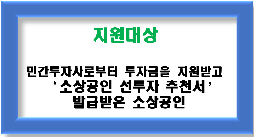 ▣ 대상 : 민간투자사로부터 투자금을 지원받고 '소상공인 선투자 추천서’를 발급받은 소상공인이 대상입니다.
