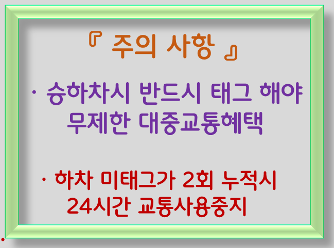 ● 하차 미태그 주의: 하차 미태그가 2회 누적되면 24시간 동안 교통 사용이 중지됩니다.