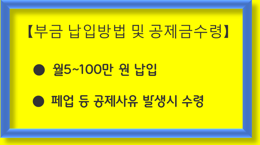 가입자는 월 5~100만 원의 부금을 납입하며, 폐업, 퇴임, 노령, 사망 등의 사유 발생 시 공제금을 받을 수 있습니다.