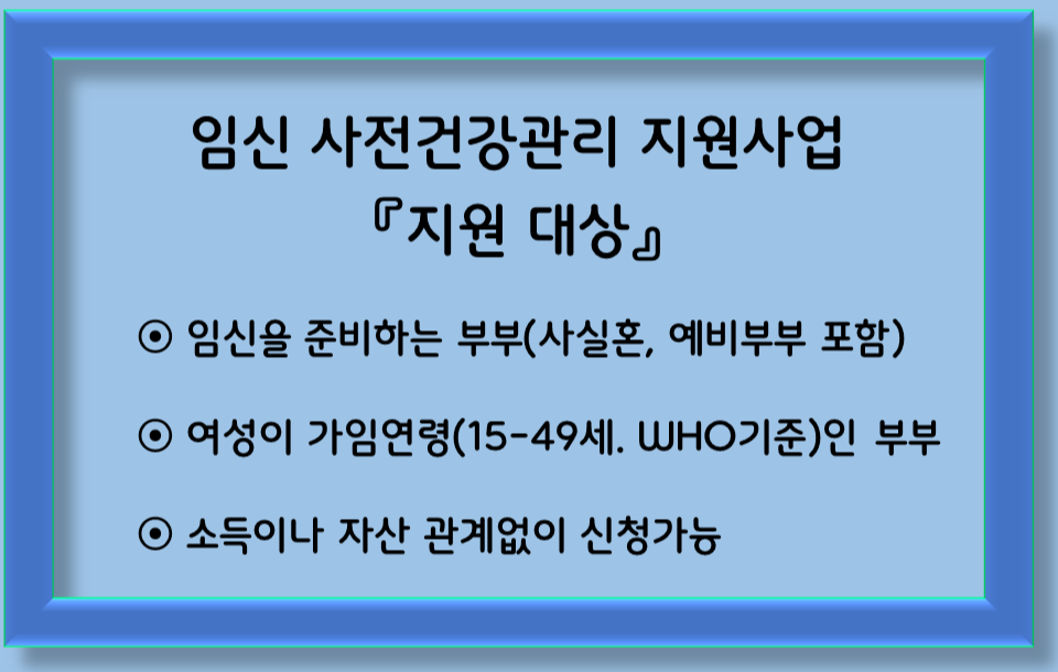 이 사업의 지원대상은 임신을 준비하는 부부로, 사실혼 및 예비부부도 포함됩니다. 특히 여성이 가임연령(15~49세, WHO 기준)인 부부가 대상입니다. 소득이나 자산에 관계없이 신청할 수 있습니다.