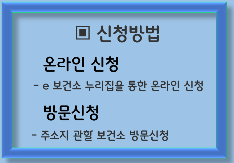 ① 신청은 주소지 관할 보건소를 방문하거나 e보건소 온라인 포털을 통해 가능합니다.
