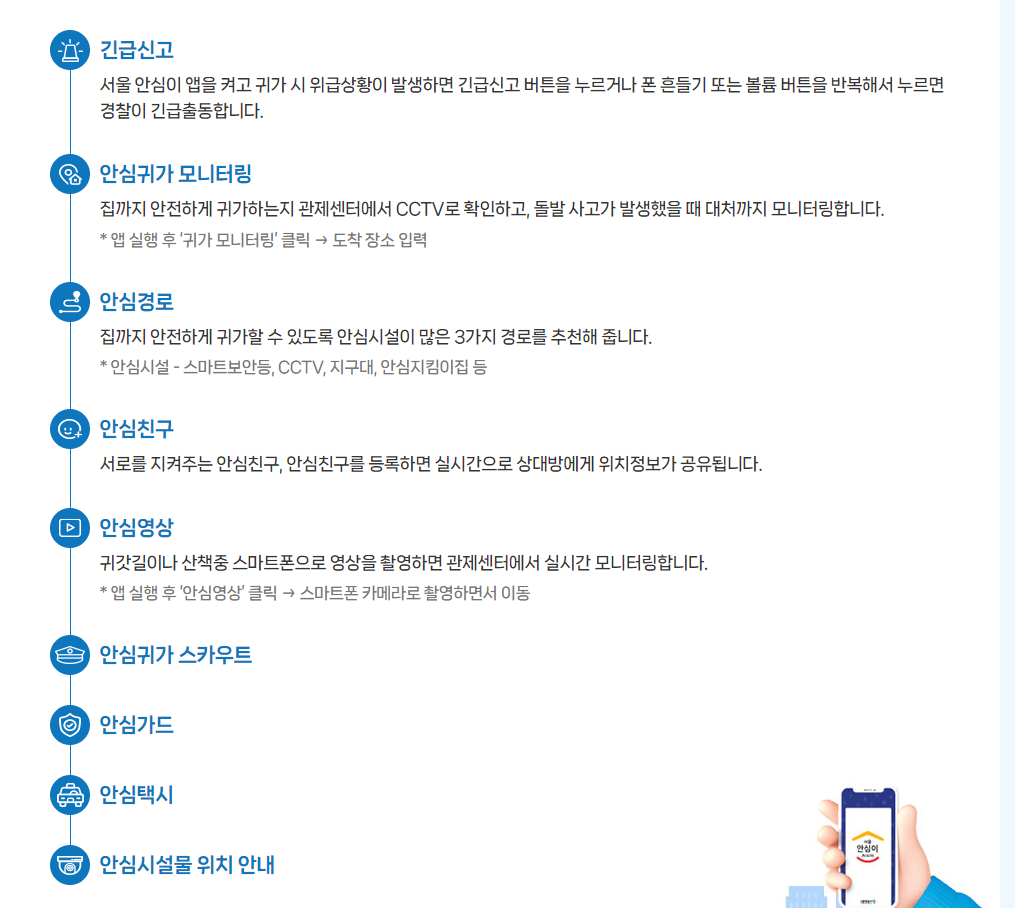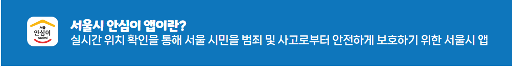 안심이 앱’은 서울시를 대표하는 안심귀가 서비스입니다. 자치구의 CCTV 관제센터가 컨트롤타워가 되어 서울 전역에 설치된 6만 대 CCTV와 안심이앱을 연계하여 구조지원까지 하는 24시간 안심귀가앱입니다.