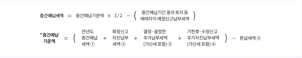 | 부동산 매매업자 | 중간예납기간(1.1.~6.30.) 중에 매도한 토지 또는 건물에 대해여 토지등 매매차익 예정신고 · 납부세액이 중간예납기준액의 50%를 초과하는 경우 |