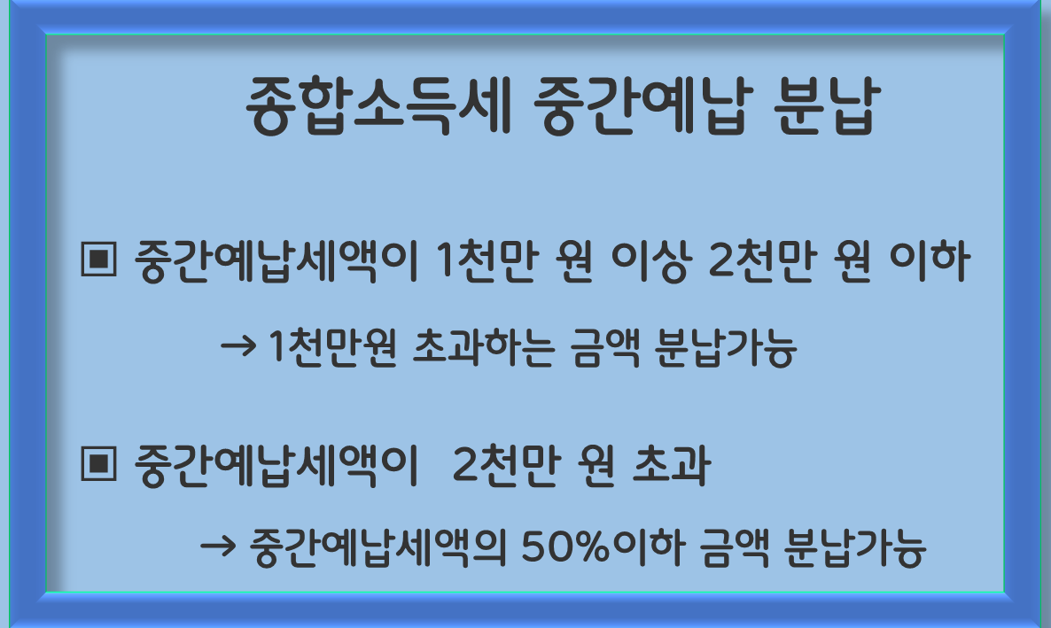 ▶ 중간예납세액이 2천만원 초과한경우 : 2천만 원을 초과한 금액의 50% 이하의 금액이 분납대상금액입니다.