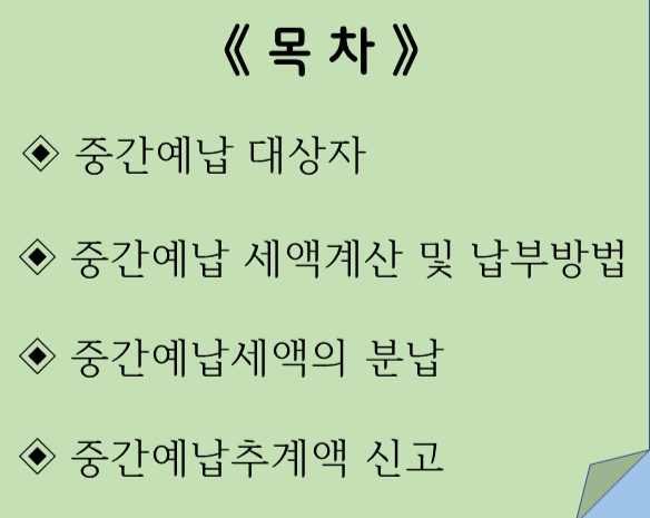 이글에서는 종합소득세 중간예납 대상자, 중간예납세액계산 및 납부방법, 중간예납추계액신고 등에 대하여 말씀 드리겠습니다.