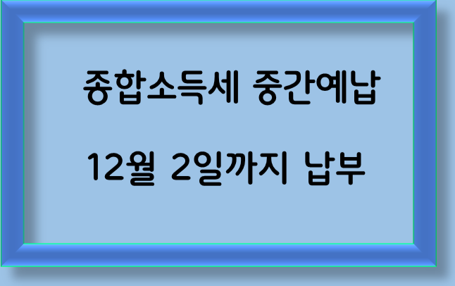 ▶ 중간예납세액의 납부기한 : 매년 11월 30일까지 납부.(2024년도는 11월30일이 토요일 이므로 12월 2일까지입니다)
