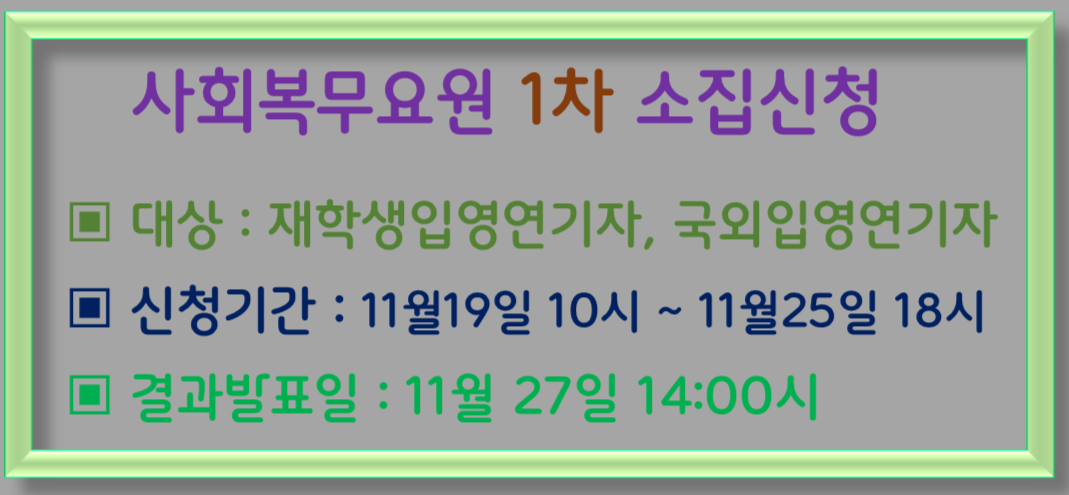 2025년도 사회복무요원 소집신청이 11월부터 시작됩니다. 사회복무요원은 두차례에 걸쳐 소집신청을 합니다.