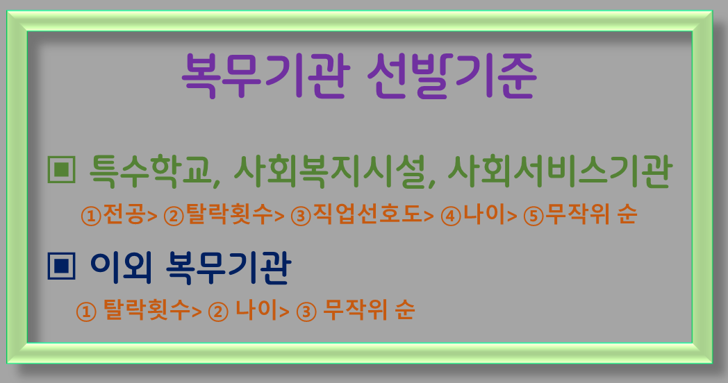 특수학교 및 사회복지시설의 경우 전공, 탈락횟수, 직업선호도, 나이, 무작위 순으로 선발됩니다.