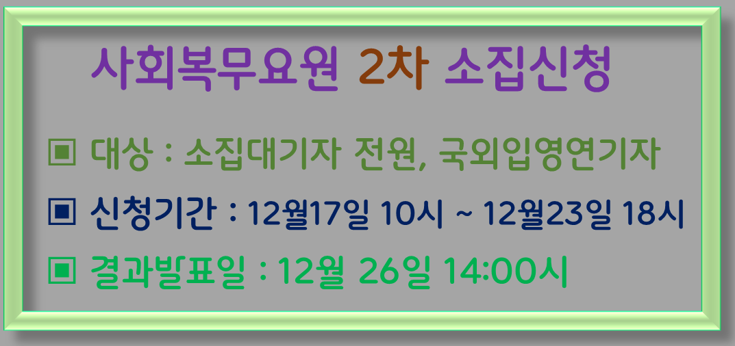 2차 사회복무요원 소집신청 접수 대상은 재학연기자(1차신청탈락자 포함), 국외입영연기자, 소집대기자 전원 입니다