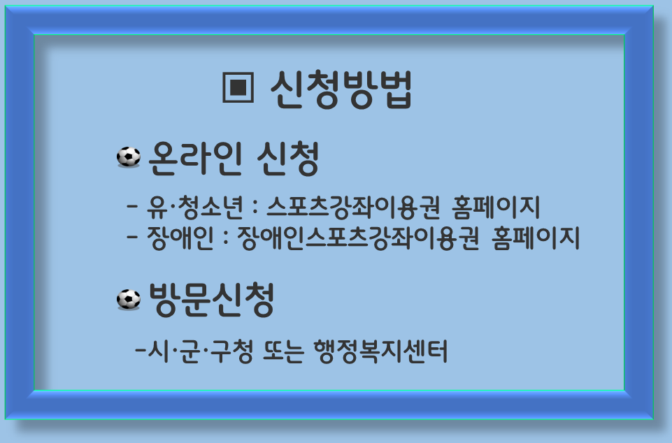 ▶온라인 신청: 유·청소년은 스포츠강좌이용권 홈페이지에서, 장애인은 장애인스포츠강좌이용권 홈페이지에서 신청할 수 있습니다.
