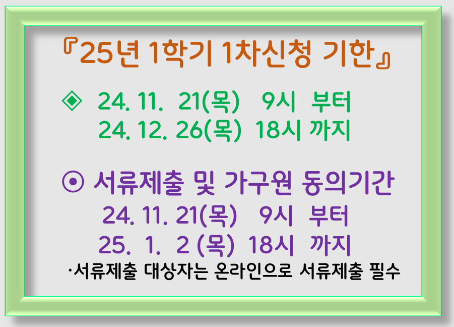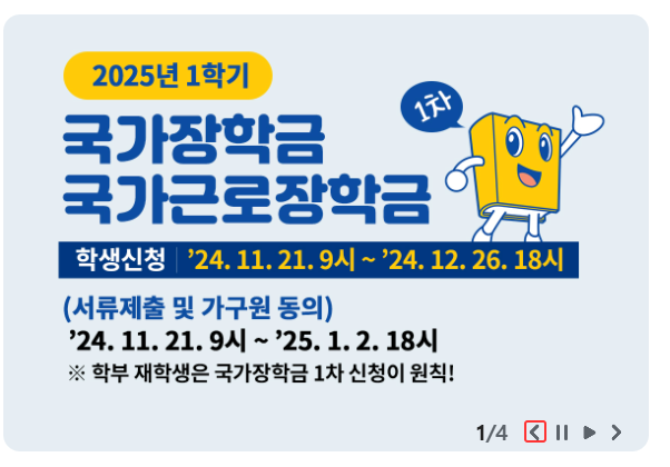 2025학년도 1학기 국가장학금 지원 대상이 확대되고, 소득 인정액 기준이 완화됨에 따라 더 많은 학생들이 혜택을 받을 수 있게 되었습니다 . 국가장학금 신청 기간을 놓치지 말고, 필요한 서류를 준비하여 꼭 신청하시기 바랍니다. 자세한 정보는 한국장학재단 누리집과 앱을 통해 확인할 수 있습니다. 한국장학재단 홈페이지(http://www.kosaf.go.kr)